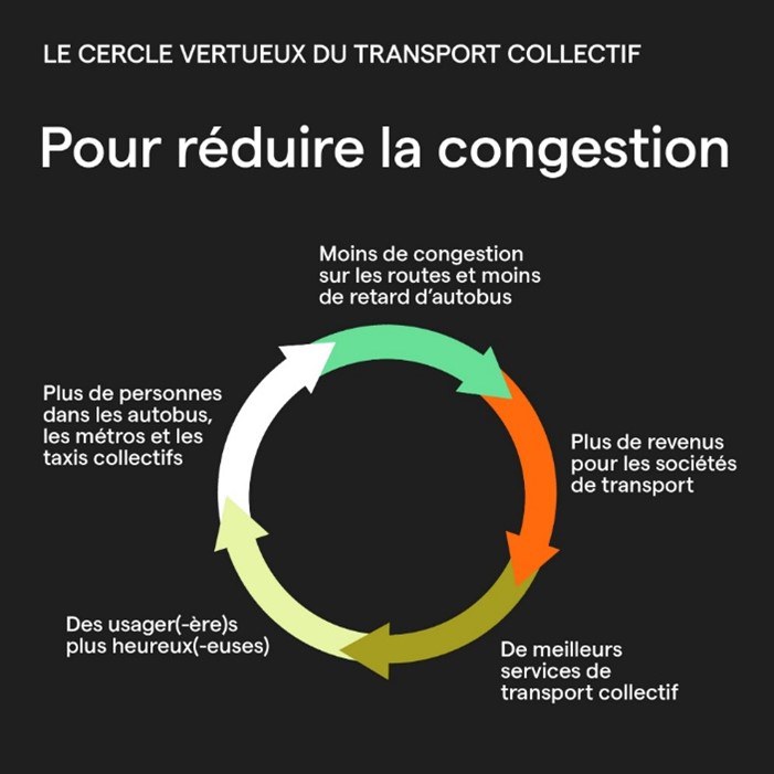 Le transport collectif ne profite pas uniquement aux personnes qui l’utilisent puisque qu’il signifie moins de pollution, moins de congestion, moins de temps perdu dans le trafic et plus de sécurité autour de notre établissement.