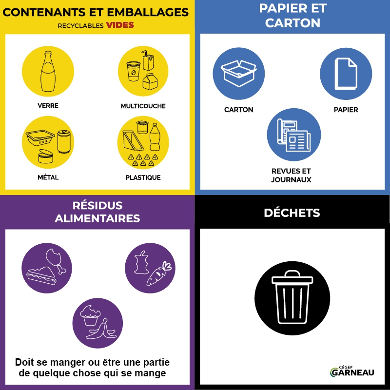 Le Cégep Garneau gère de façon responsable ses matières résiduelles en mettant en place des mesures de réduction à la source, de réemploi, de recyclage et de valorisation (3RV).