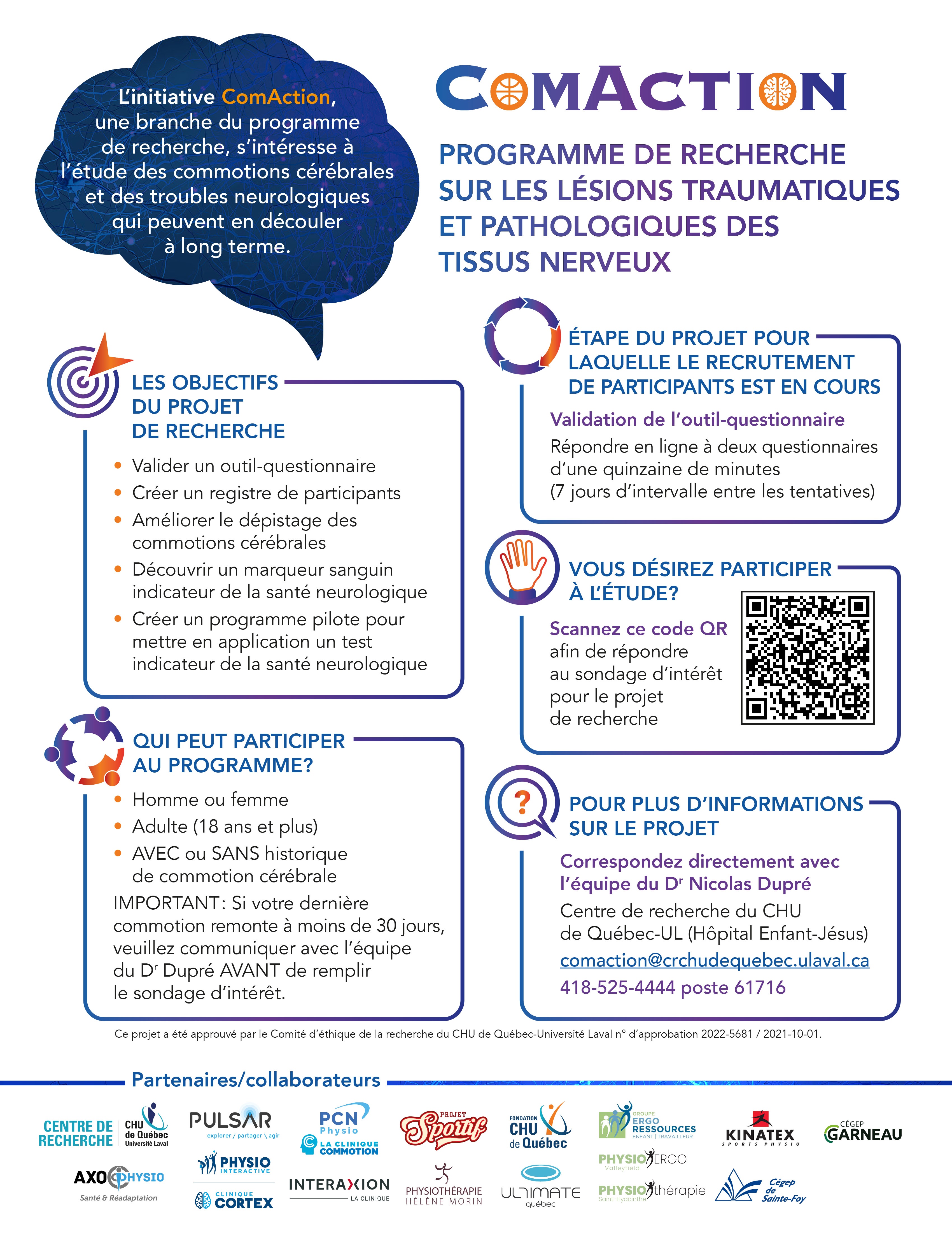 Pour toute question, vous pouvez contacter l’équipe du Dr Nicolas Dupré au comaction@crchudequebec.ulaval.ca ou au 418 525-4444, poste 61716